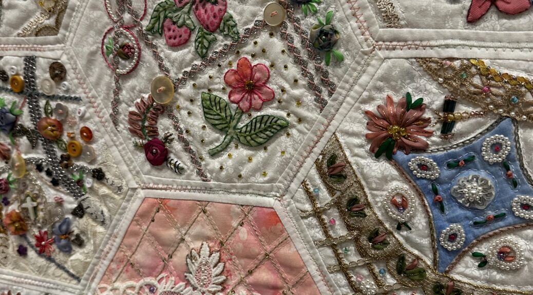 Get ready to create! This Workshop will teach your a technique where we will create 8″ hexagons and embellishing them using buttons, ribbon, trims, perle cotton, fabrics, beads and so much more.